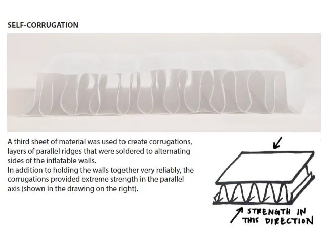 Novel corrugated polyethalene vinyl material, created by heat sealing separate sheets of vinyl. This material is highly collapsible when inactive and strong when inflated with air.
